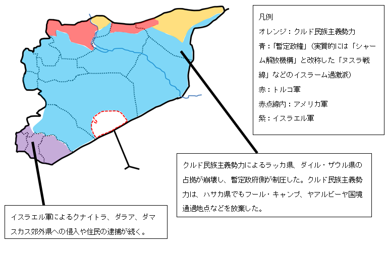 クルド民族主義勢力は、占拠地に居住するアラブの部族の民兵などを傘下に収め、「シリア民主軍」として活動してきた。しかし、「シリア民主軍」の包括性はあくまで形式的なものであり、クルド民主統一党(PYD)が主導するものに過ぎなかった。なお、PYDは北・東シリア自治当局が管轄する地域から他のクルド民族主義勢力も排除して「自治」を営んできた。ここまでの情勢推移で、領域占拠や自治は広範囲で崩壊状態にあり、クルド民族主義勢力と傘下の民兵をシリア政府に統合する問題も、クルド民族主義勢力の完敗という形で一方的に進む可能性が高い。その場合、これまで暫定政権が表明してきたクルド人の諸権利の保護などが顧みられなくなる恐れがあり、クルド人は「少数派」として劣等市民待遇を受け、彼らの民族主義運動や政党活動も困難になる可能性がある。